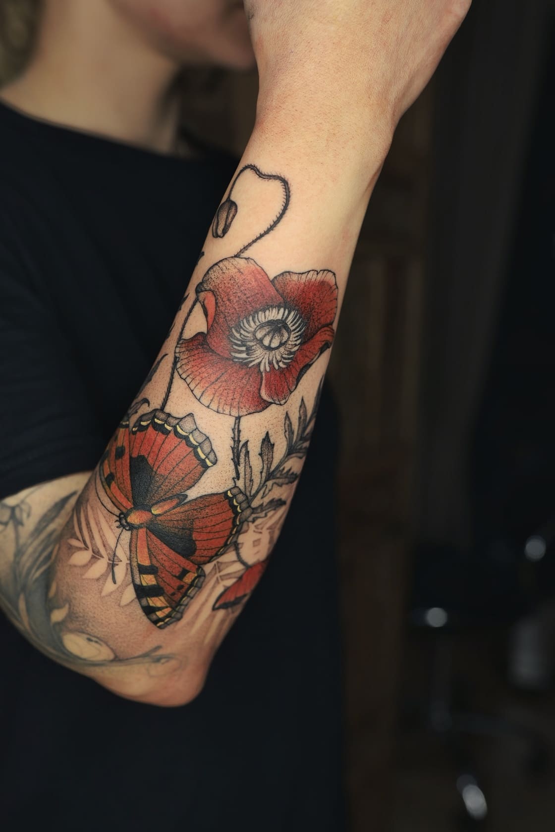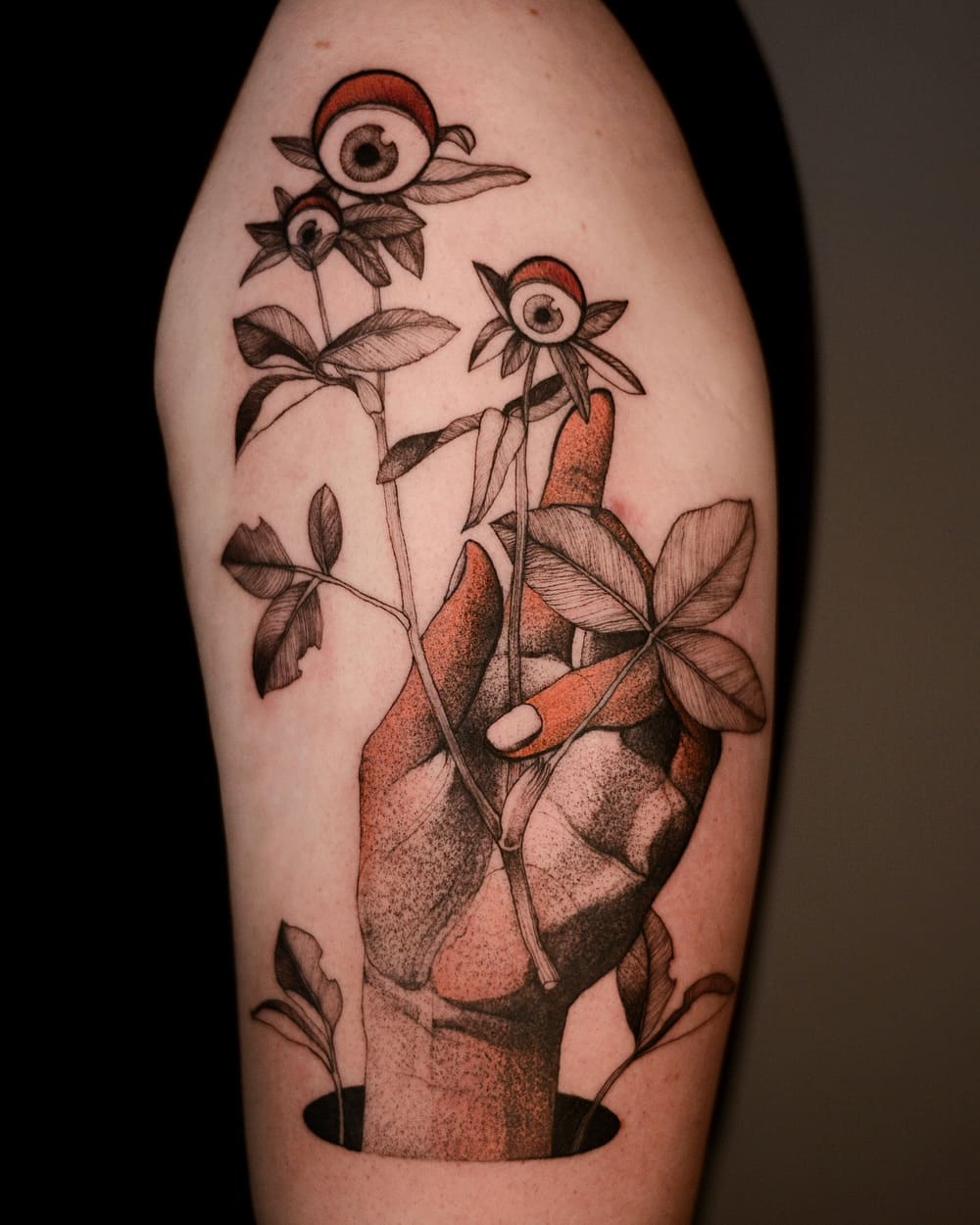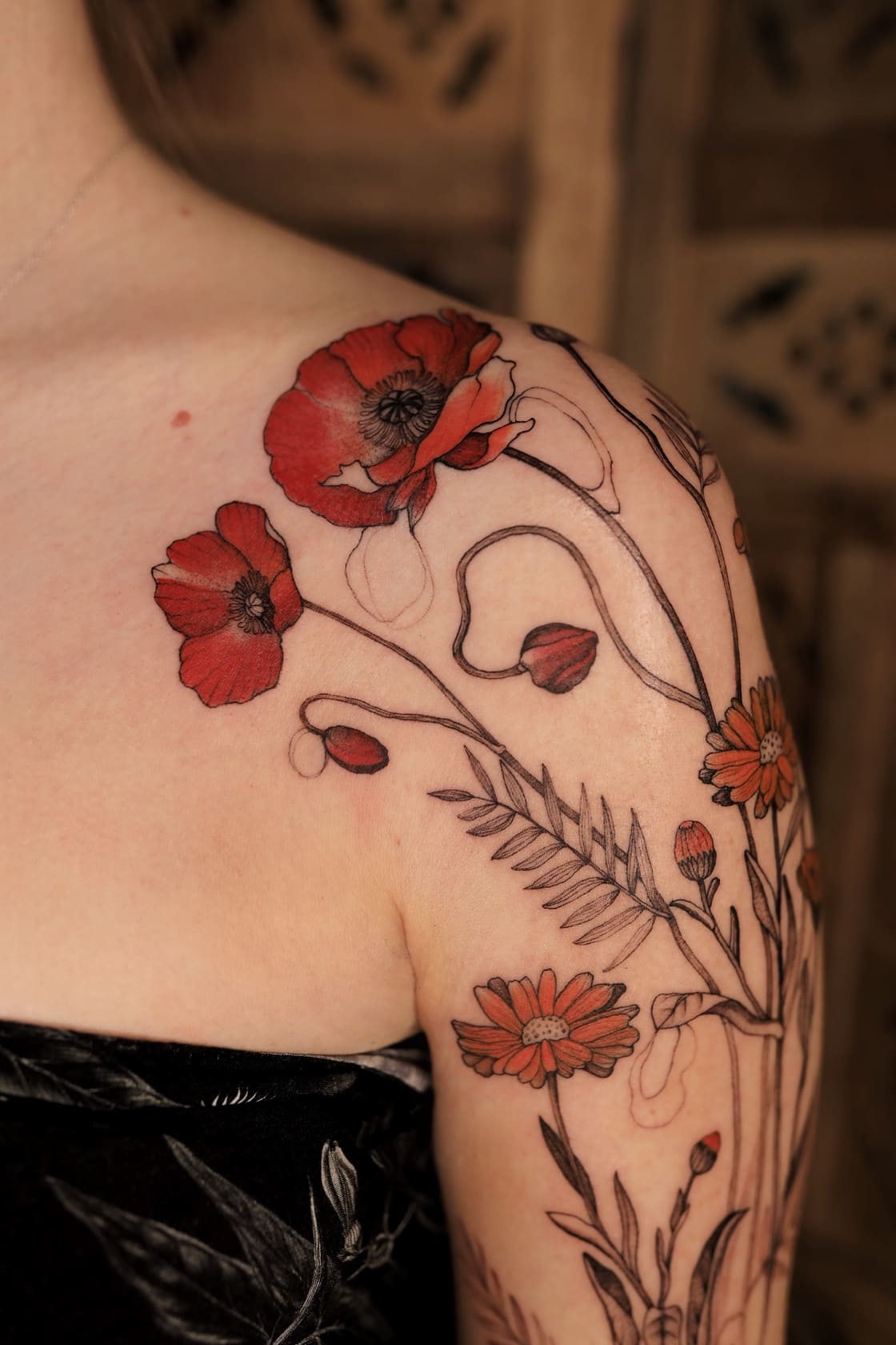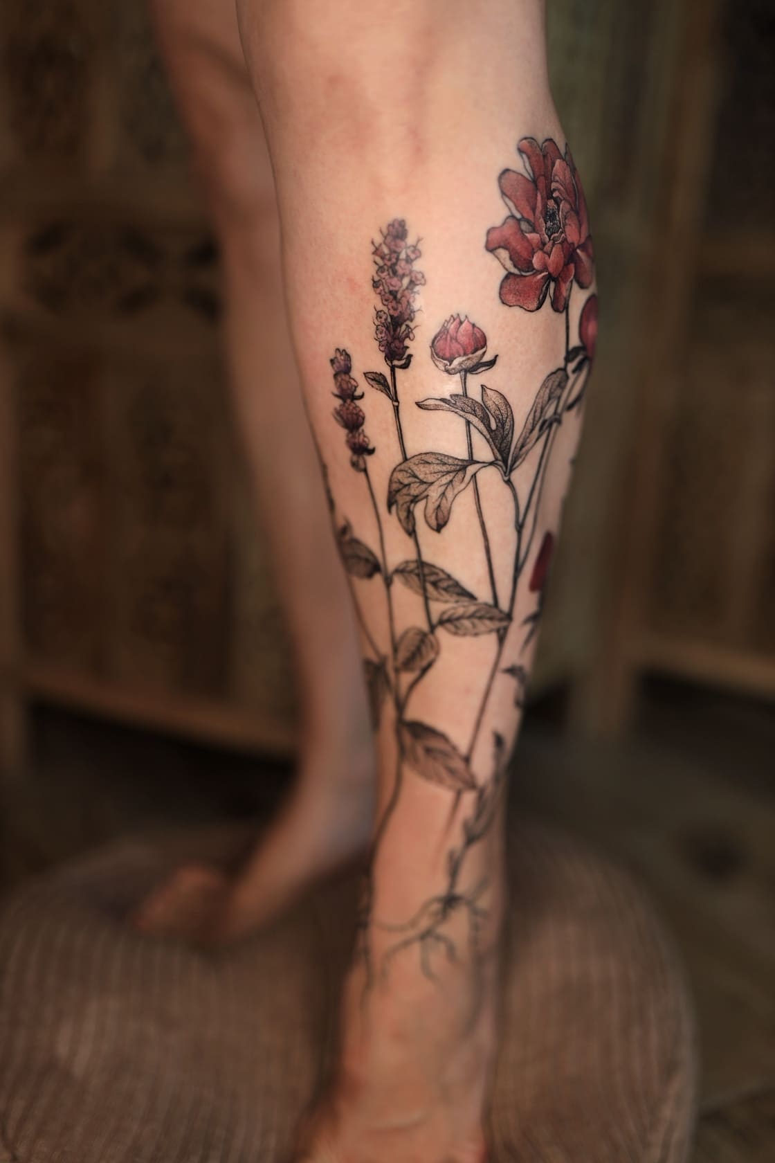 This style works beautifully at any scale – from small, subtle tattoos on the hand or foot to large compositions wrapping around the back or thigh. Botanical tattoos also combine perfectly with other motifs such as animals, portraits or abstract elements.
