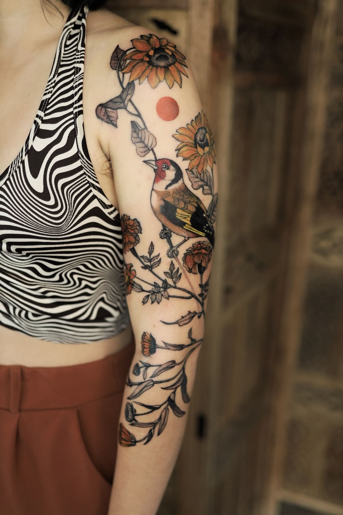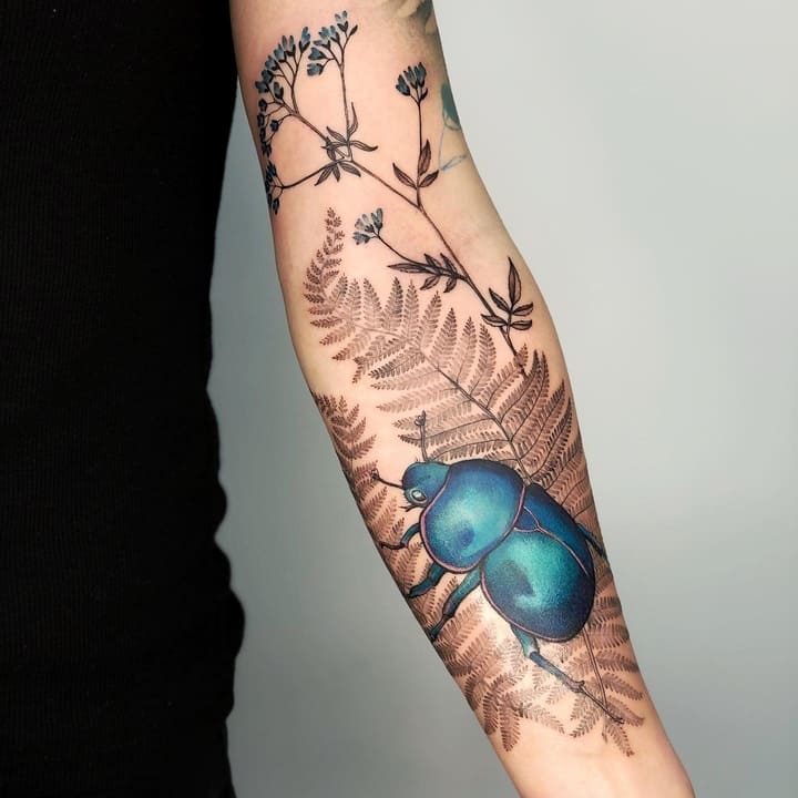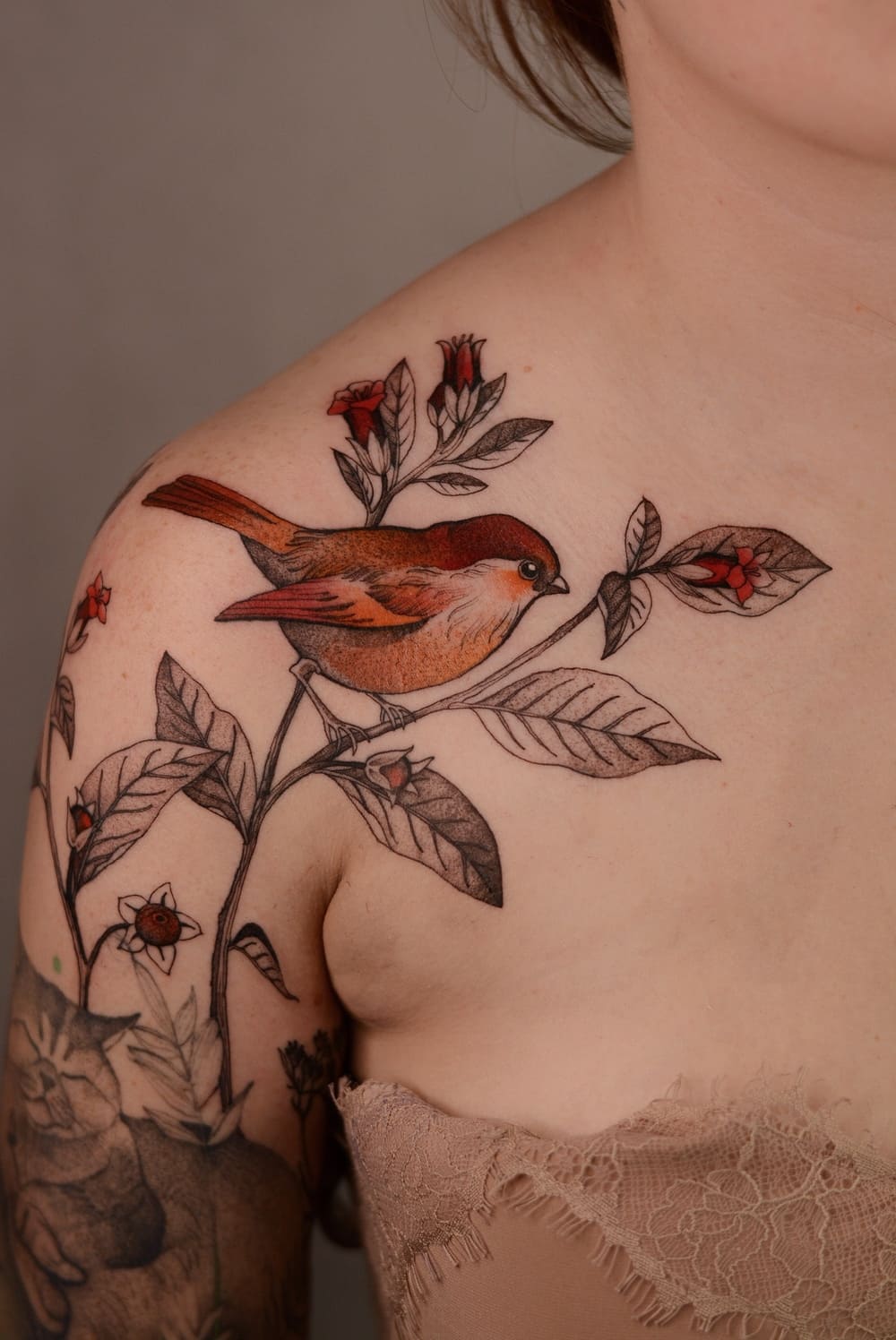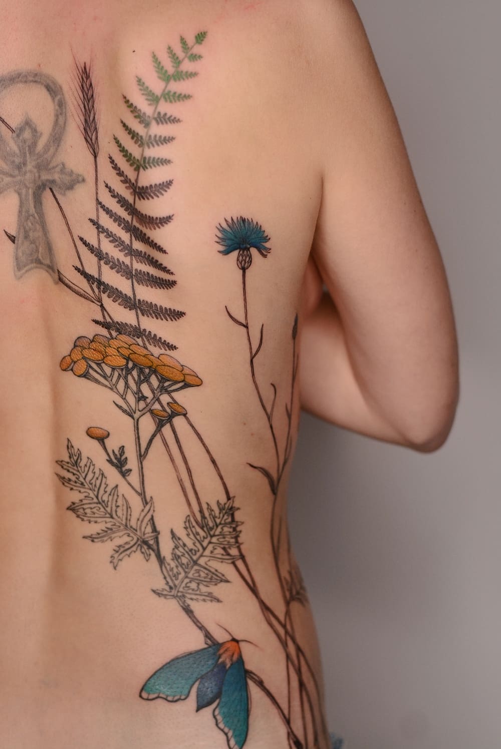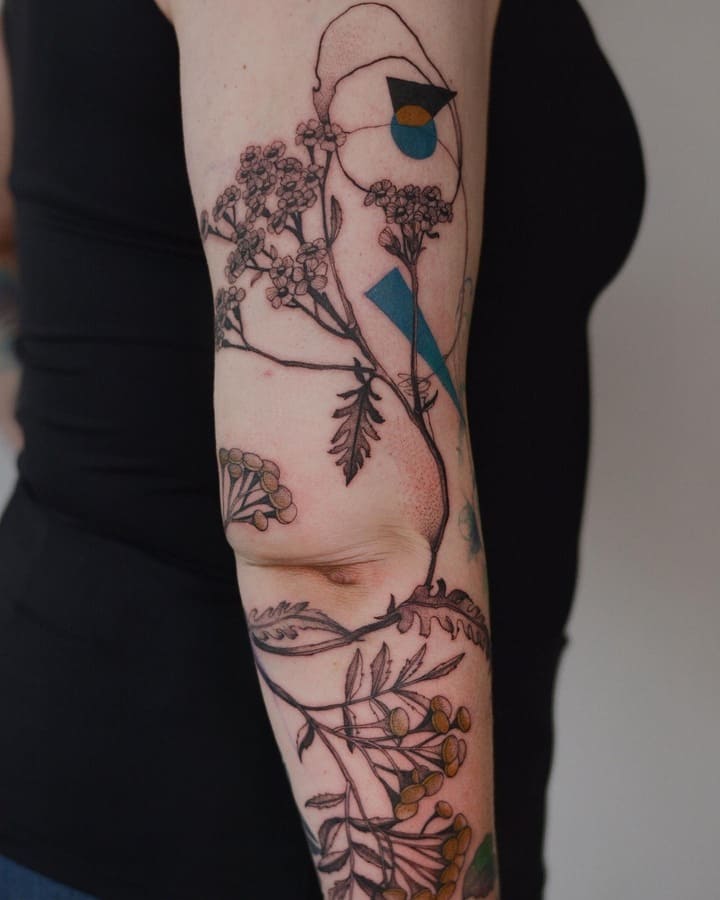 Botanical tattoos combine perfectly with other themes such as animals or abstract elements.
