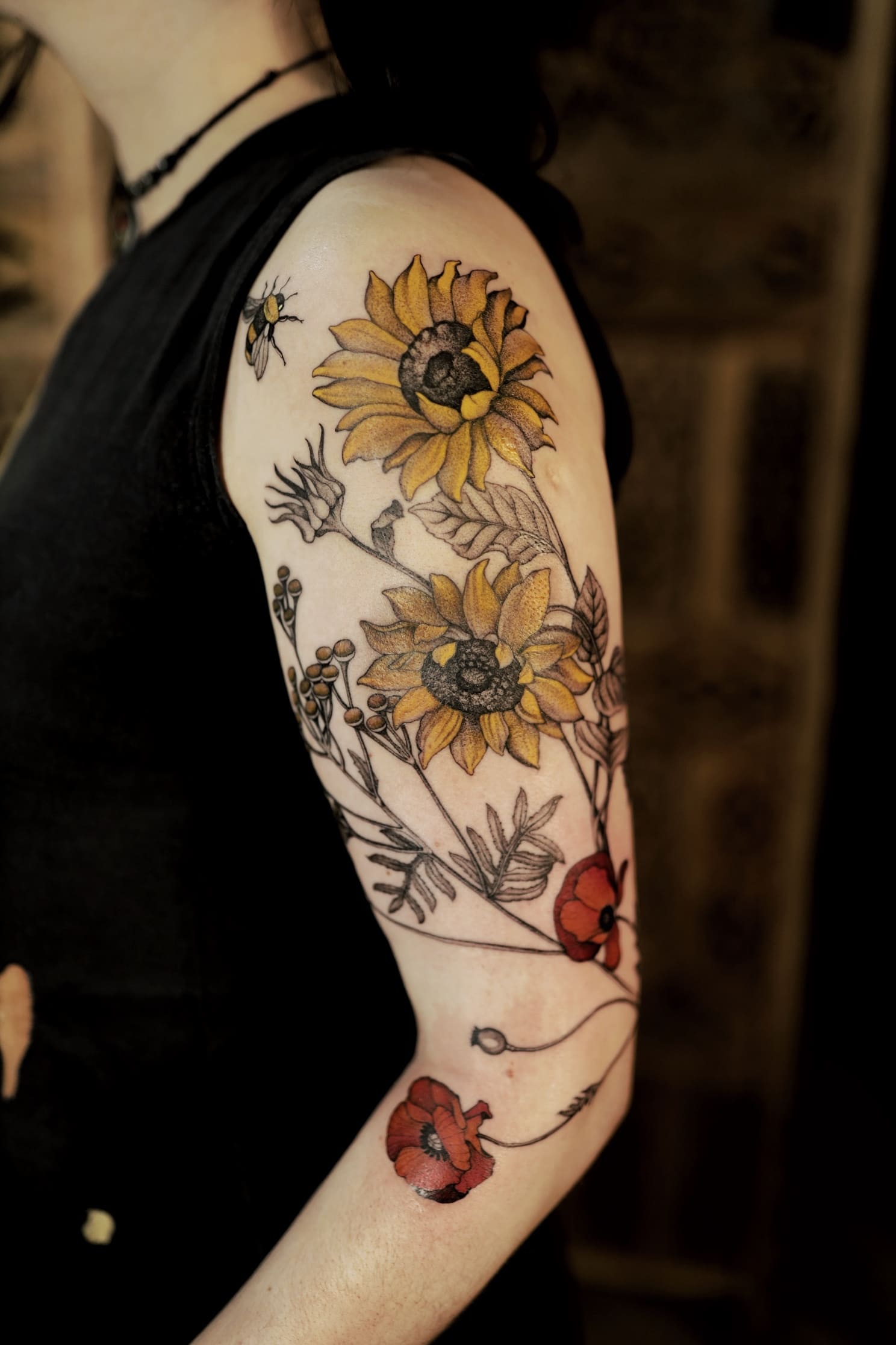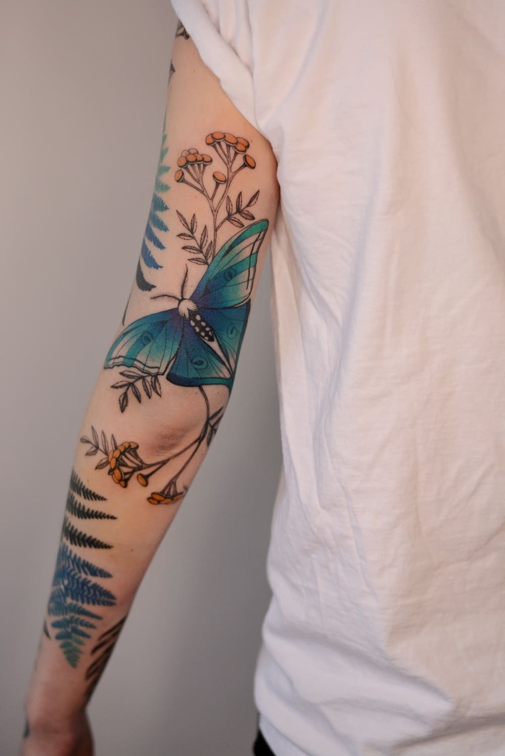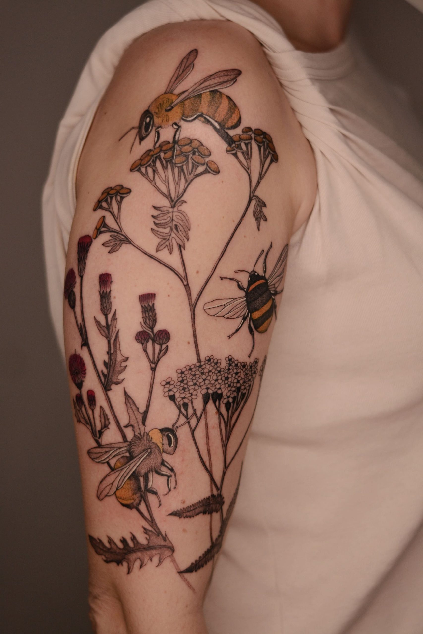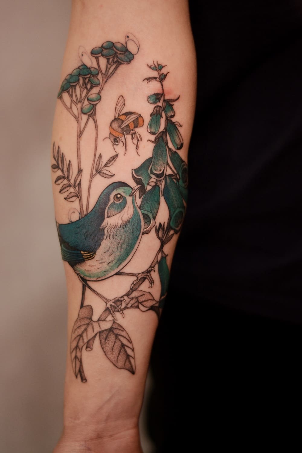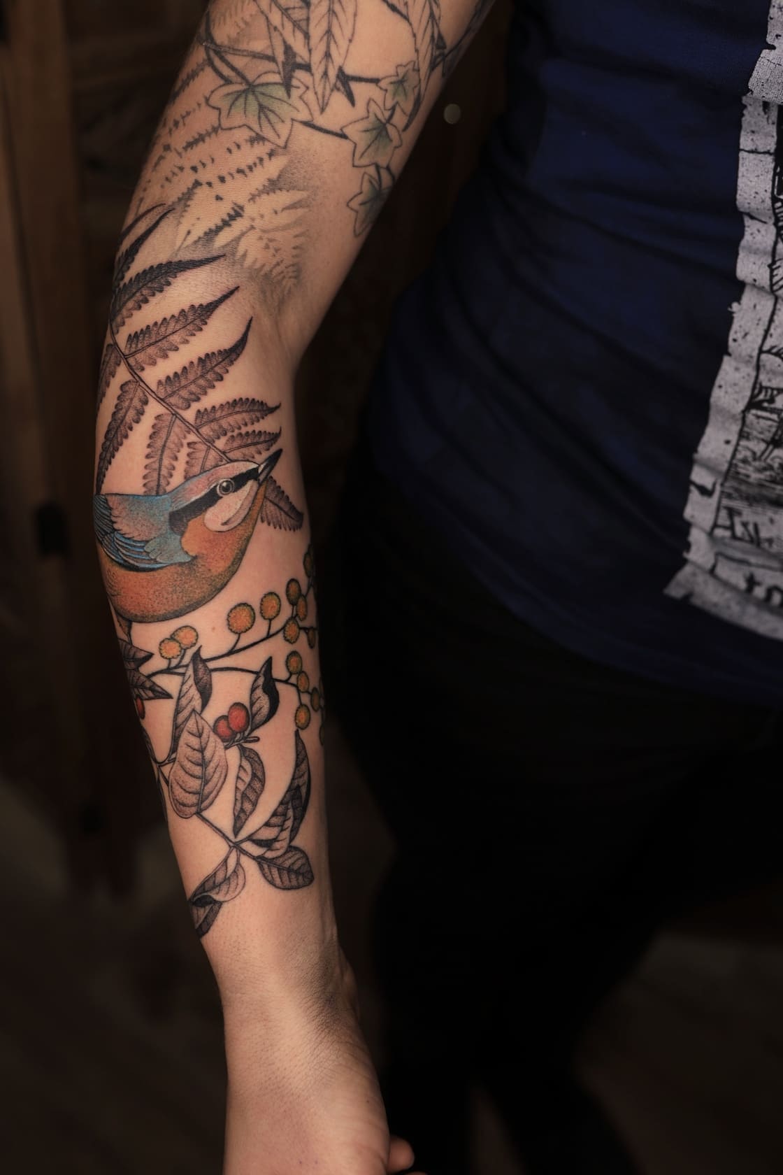 Botanical tattoos combine perfectly with other themes such as animals or abstract elements.