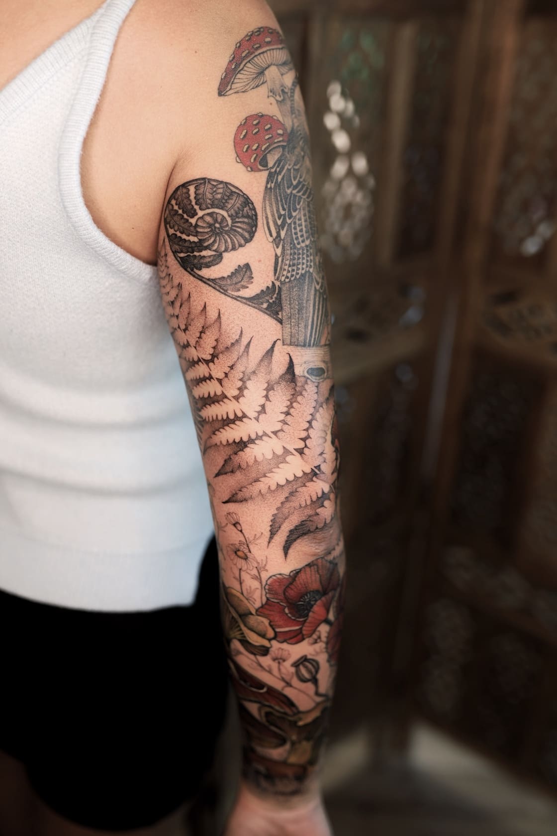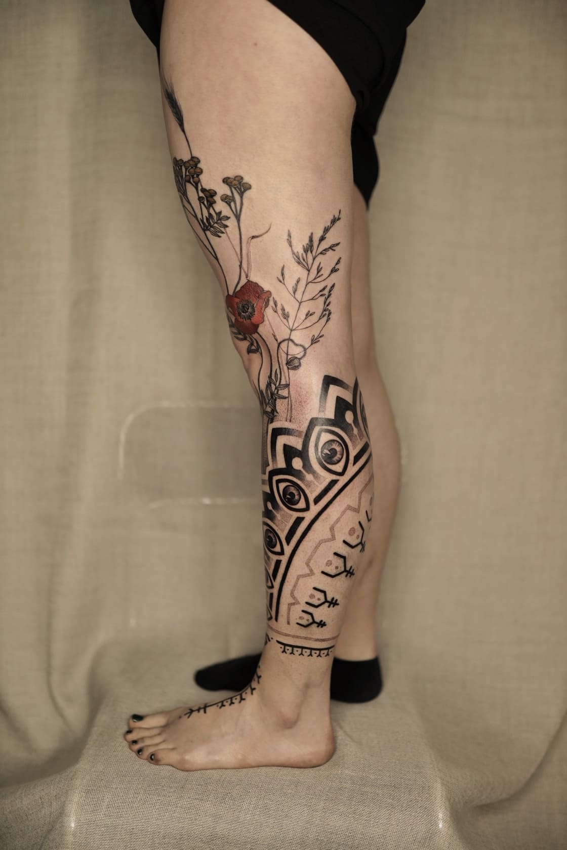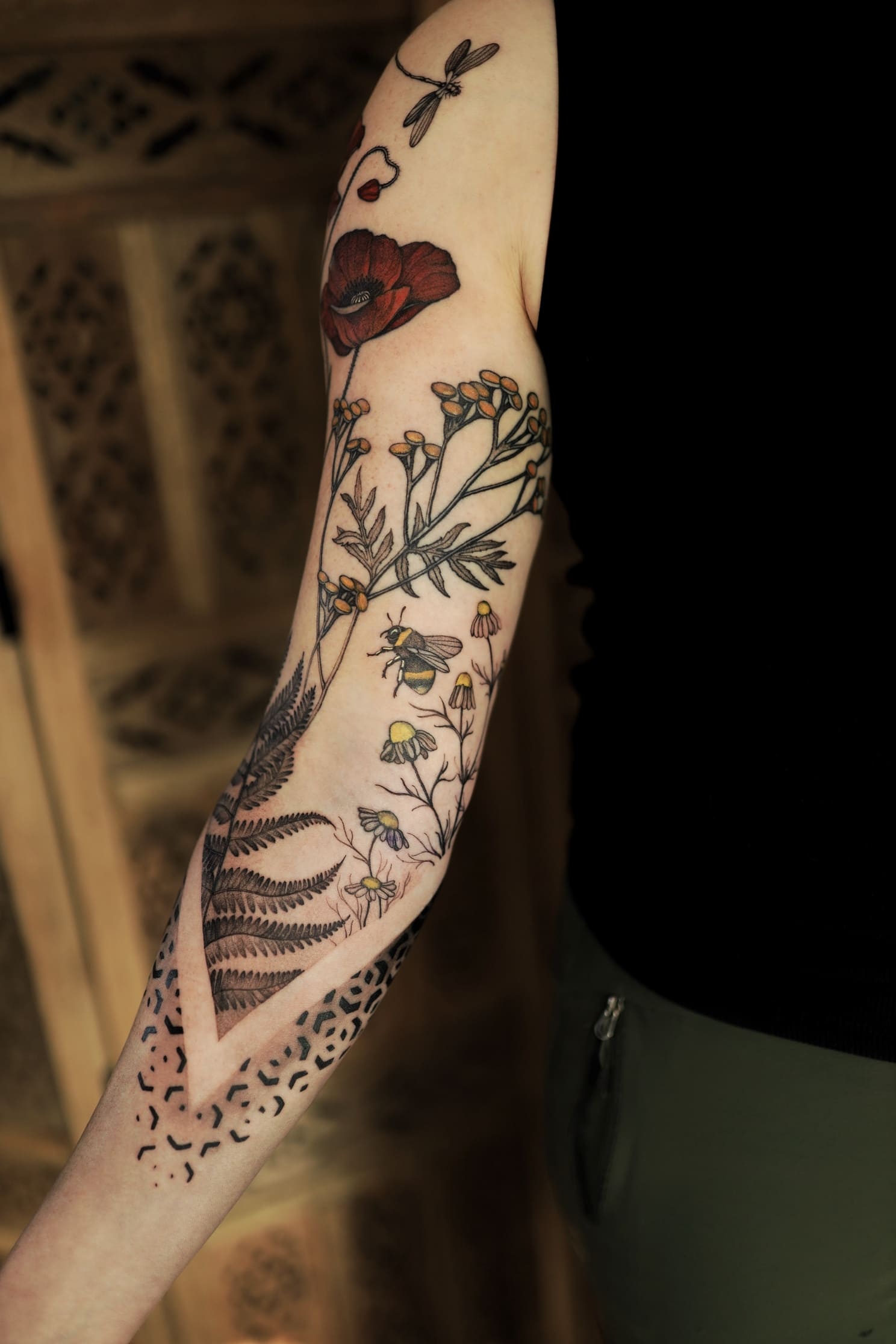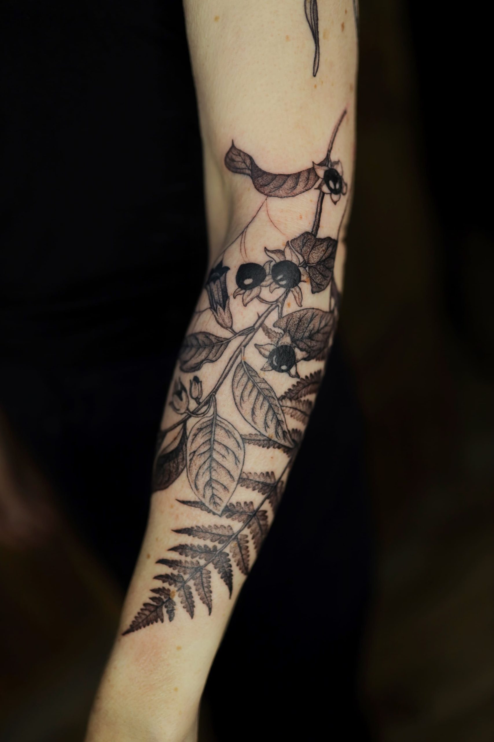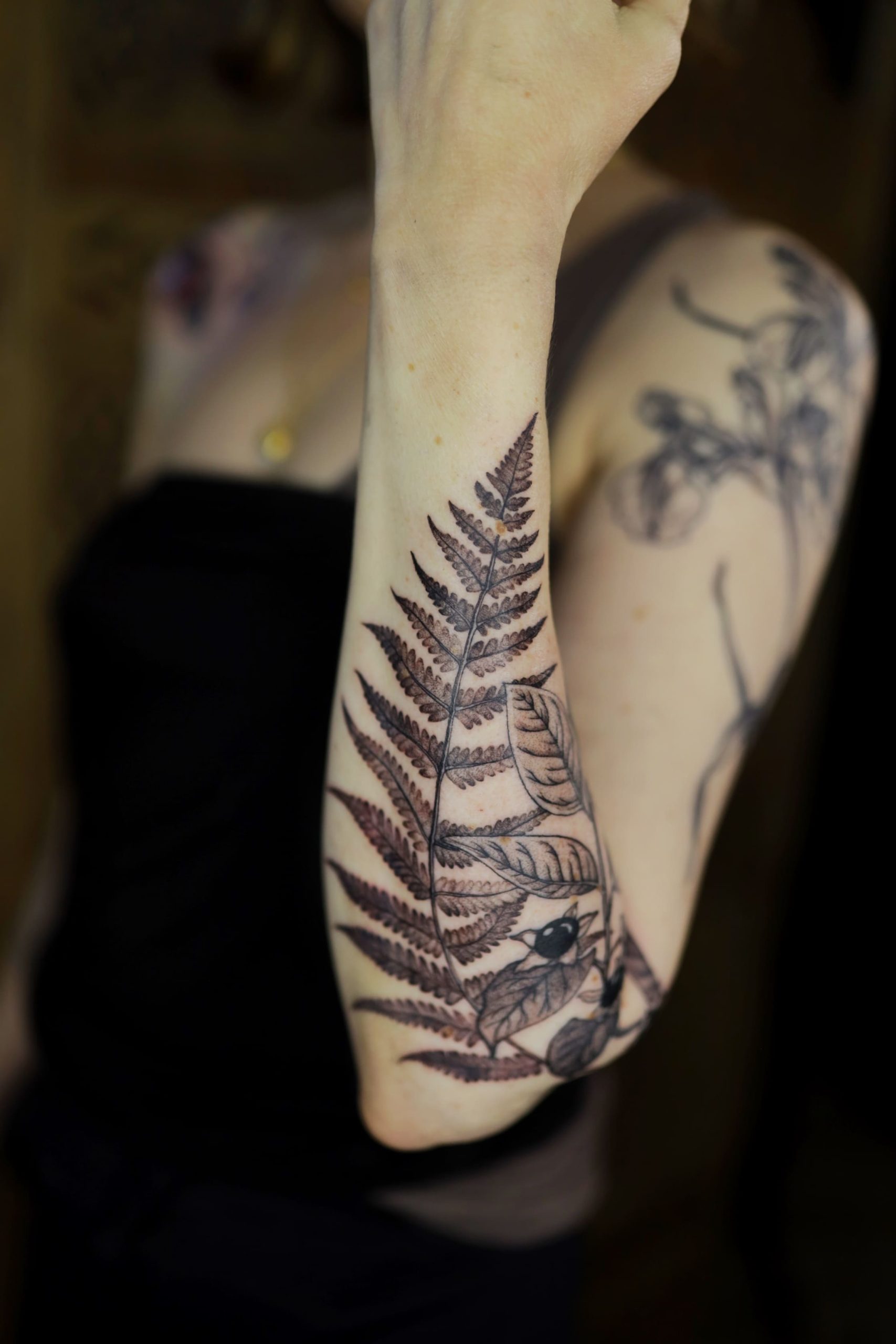 When creating botanical tattoos, I draw inspiration directly from nature – fern leaves, wild flowers, tree branches and the geometric rhythm of petals. I also often use my own garden at Amanita Art Village as a source of inspiration, where closeness to plants accompanies me every day. Thanks to this, each tattoo is not only a design on the skin, but also part of a greater story – a connection between human and nature.