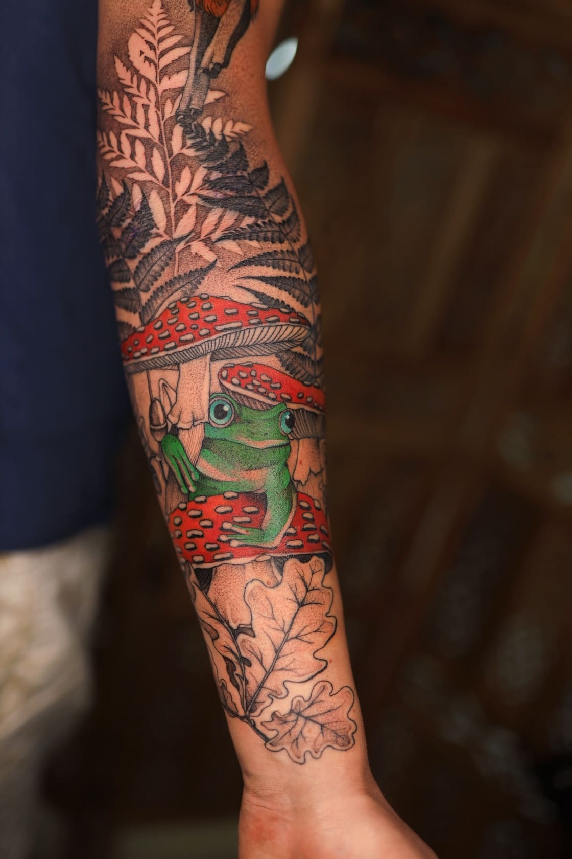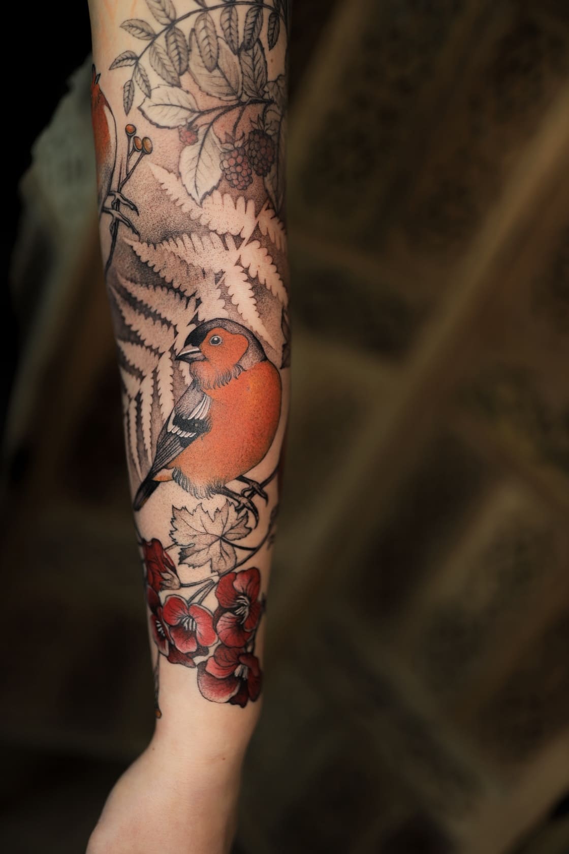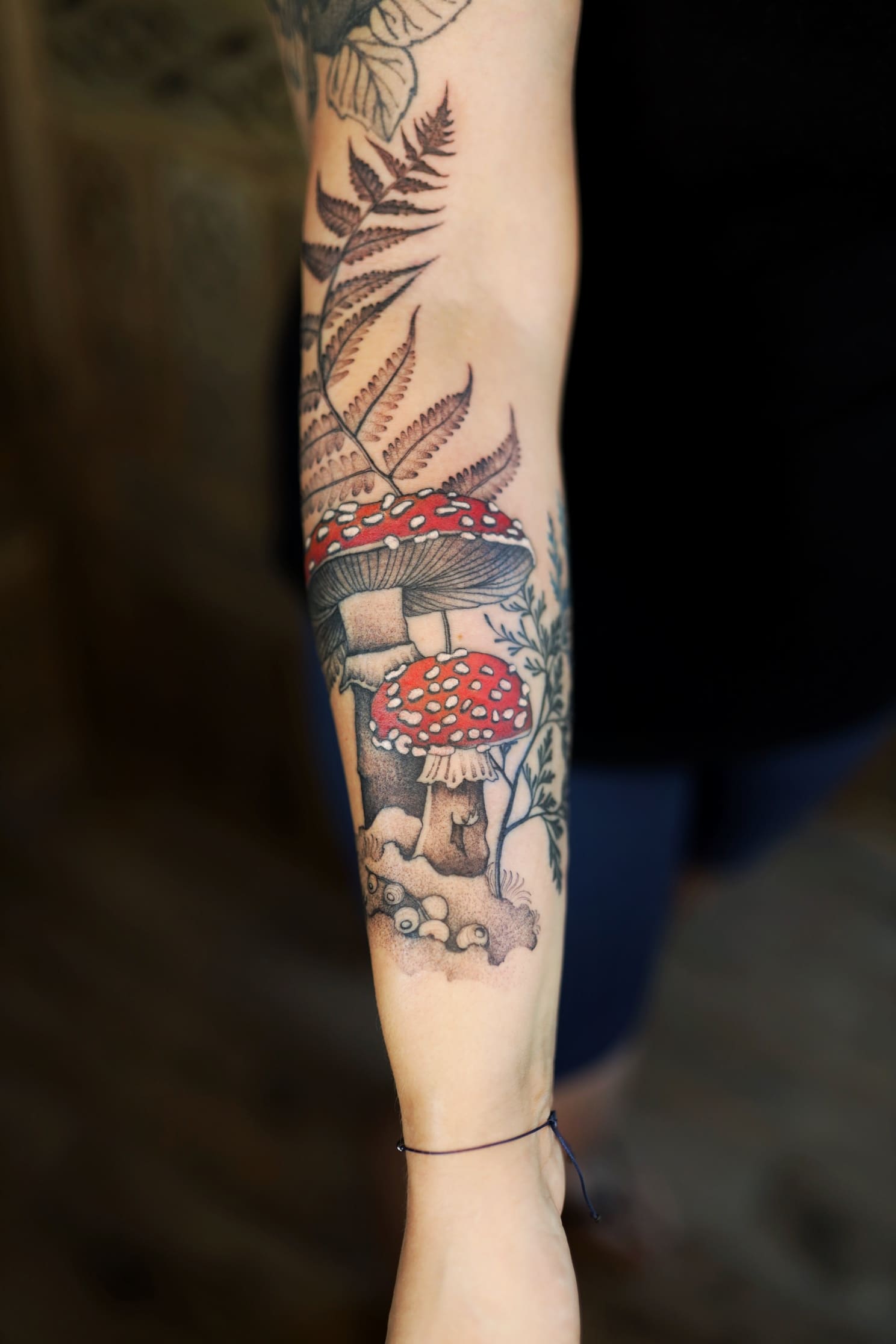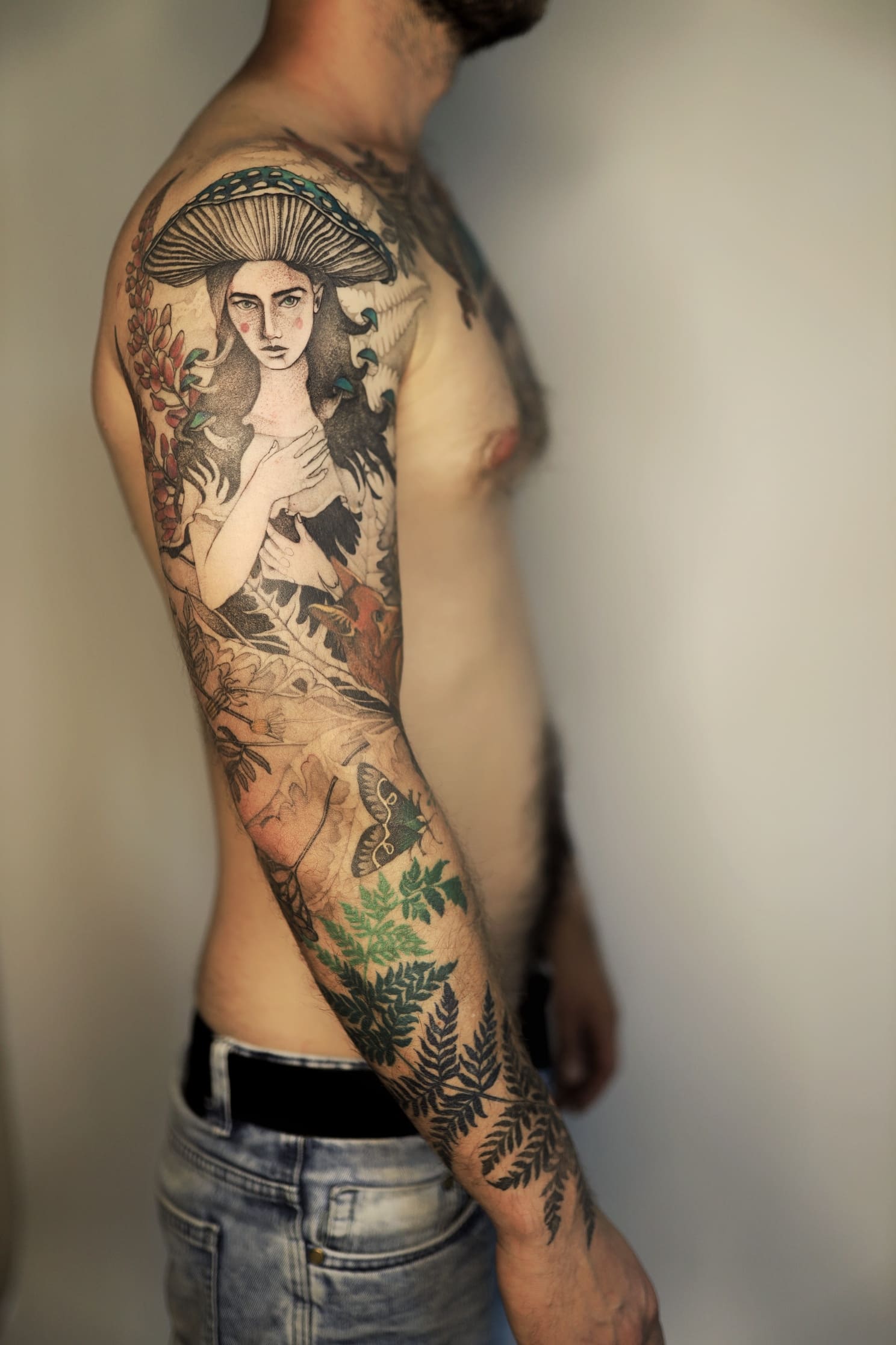 When creating botanical tattoos, I draw inspiration directly from nature – fern leaves, wild flowers, tree branches and the geometric rhythm of petals. I also often use my own garden at Amanita Art Village as a source of inspiration, where closeness to plants accompanies me every day. Thanks to this, each tattoo is not only a design on the skin, but also part of a greater story – a connection between human and nature.
