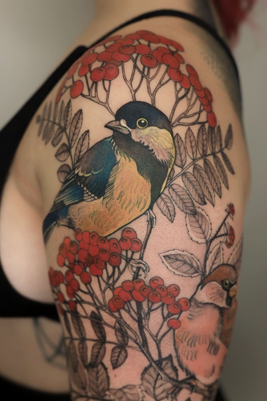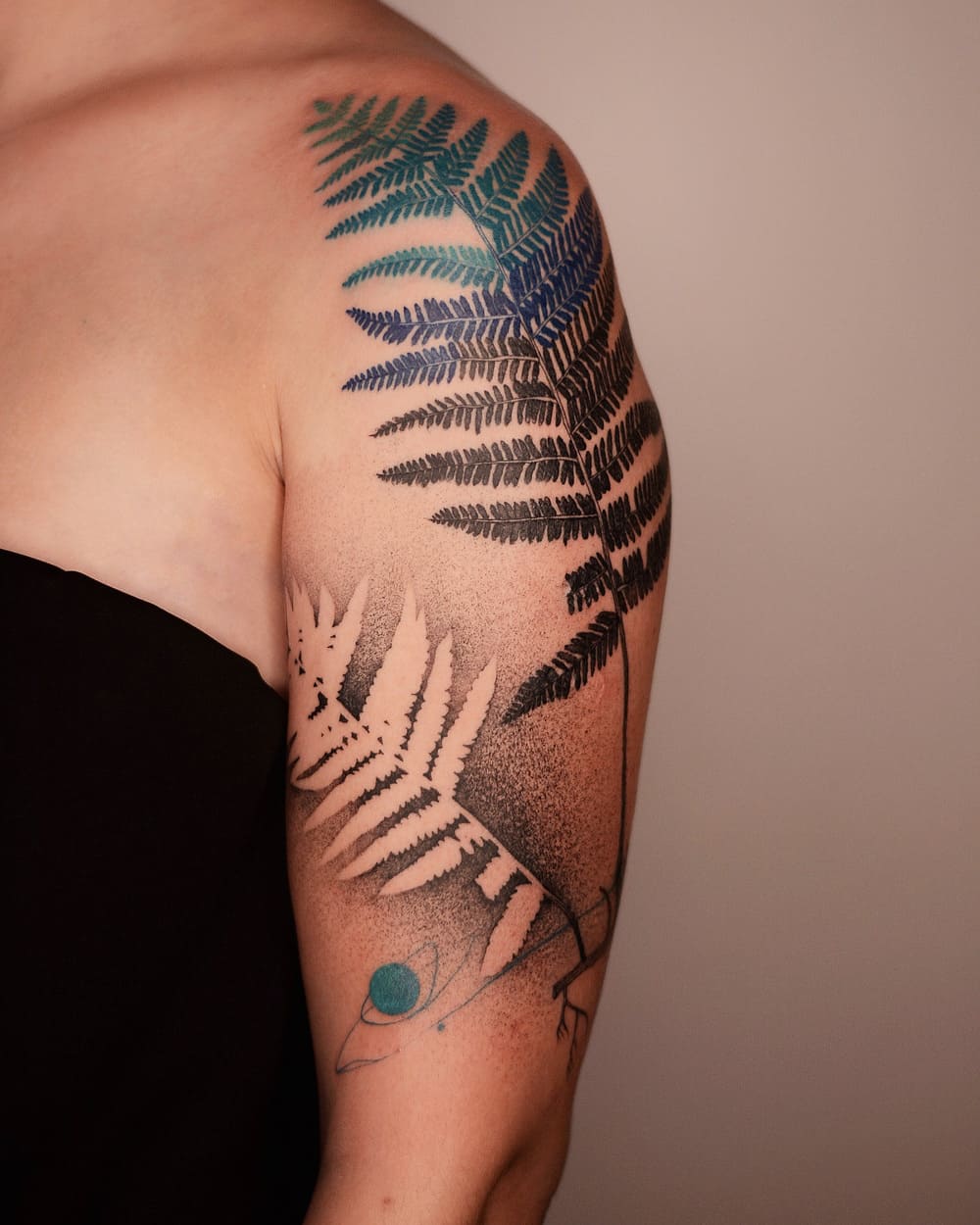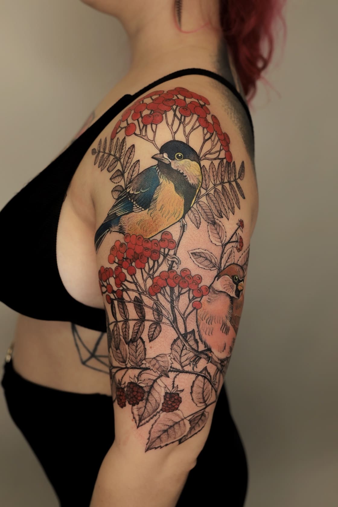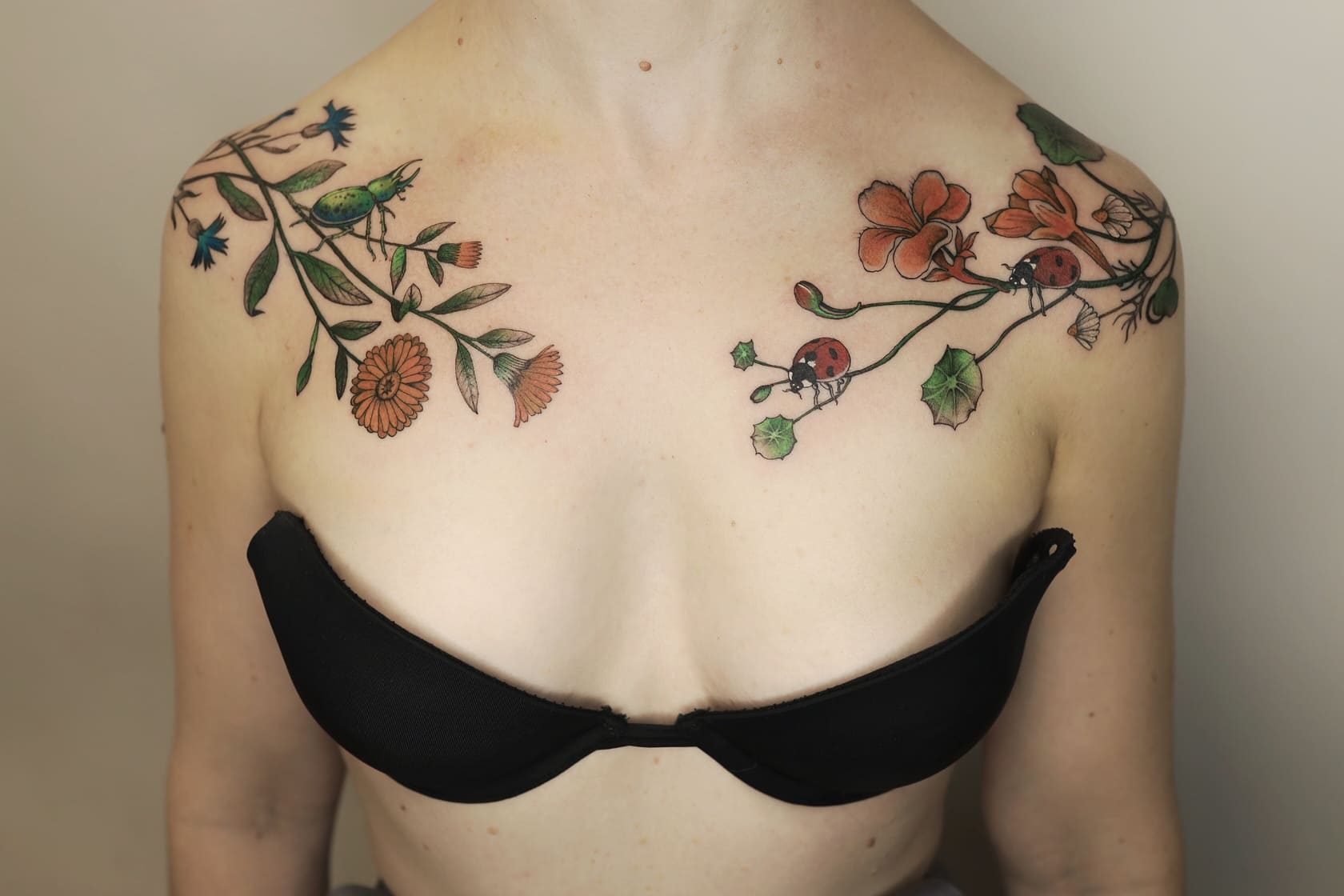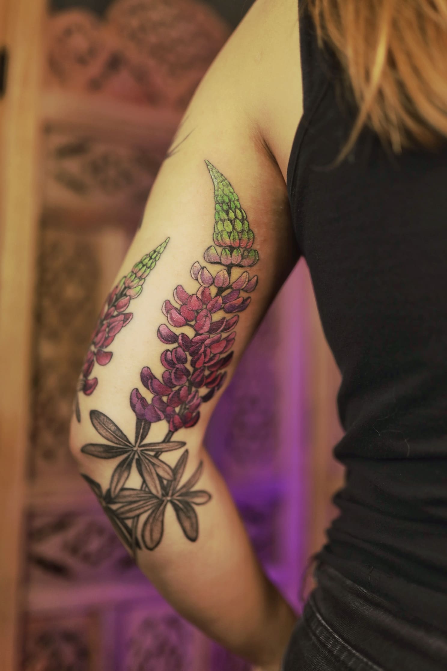 When creating botanical tattoos, I draw inspiration directly from nature – fern leaves, wild flowers, tree branches and the geometric rhythm of petals. I also often use my own garden at Amanita Art Village as a source of inspiration, where closeness to plants accompanies me every day. Thanks to this, each tattoo is not only a design on the skin, but also part of a greater story – a connection between human and nature.