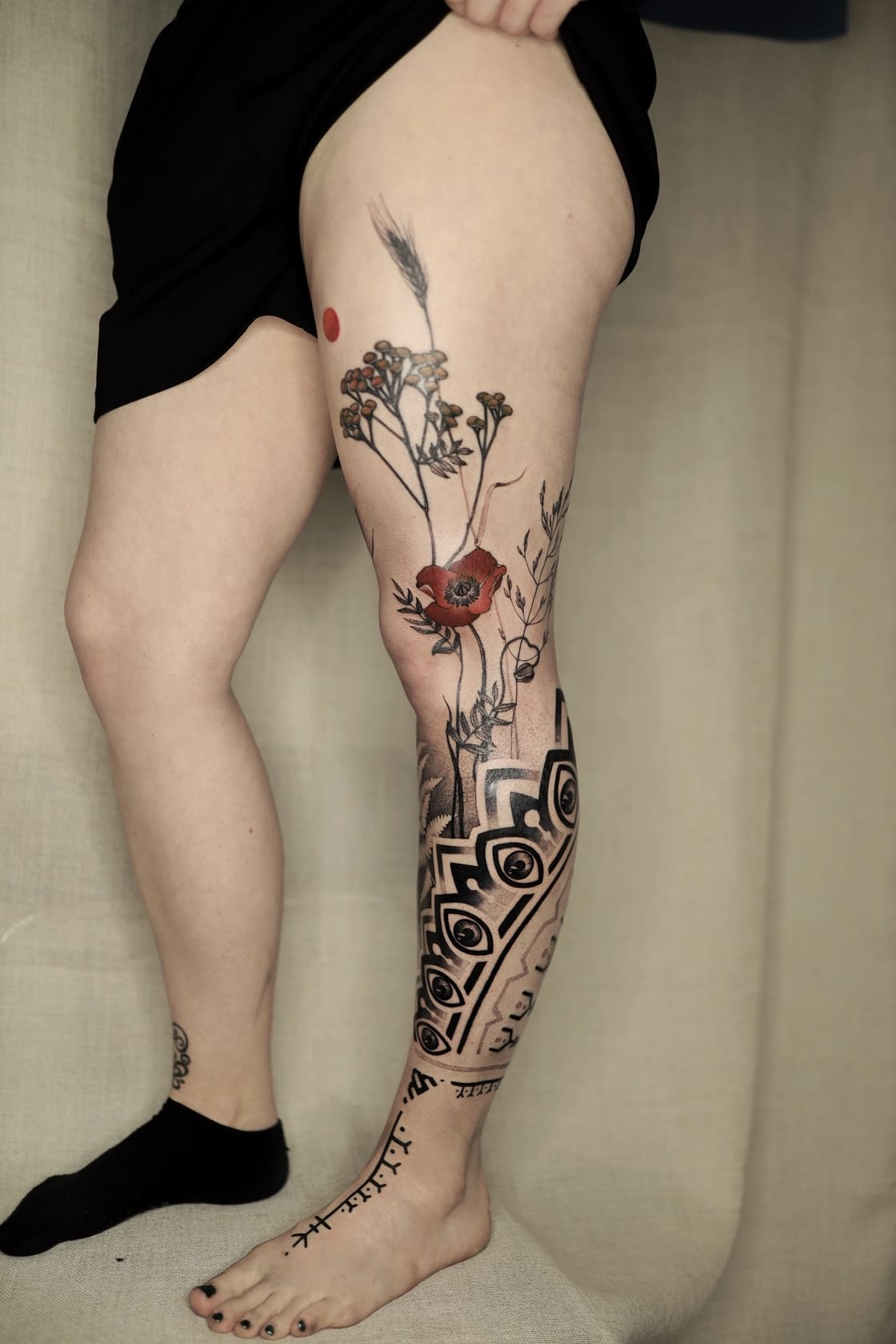 Botanical tattoos carry rich symbolism. Flowers are often associated with femininity, the cycle of life and the beauty of impermanence. Leaves can symbolize renewal, harmony and balance, while vines represent strength, growth and continuous development. Botanical designs also offer great aesthetic freedom – they can be realistic and full of detail, or abstract and graphic, reminiscent of a sketch or an illustration.