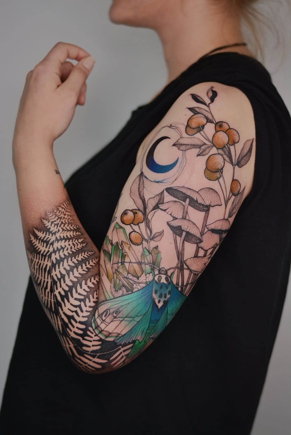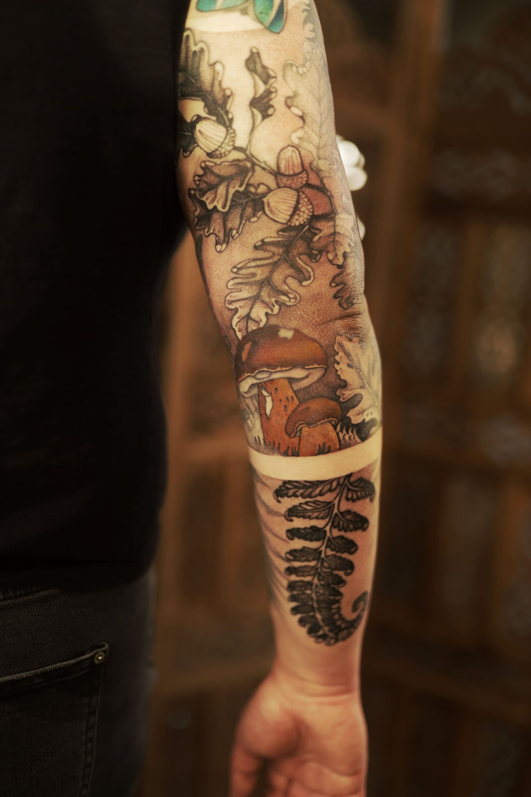 Mushroom tattoos combine beautifully with plants, animals and abstract elements.